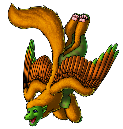 Derivative WorksHeight: 3'1" at the shoulder; ss (large 3') body size, E2E4 (short) ears, ww (double-color) wingtips, Tt (long bushy) tail, Y2Y4 (dark blue) eyes, C8C8 (green) body in Ll (medium) value, X2X8 (orange) furnishings in Uu (medium) value, I3I4 (orange) wings in Nn (medium) value, P4P6 (mottled pattern) in R2R8 (brown) color in Aa (medium) value