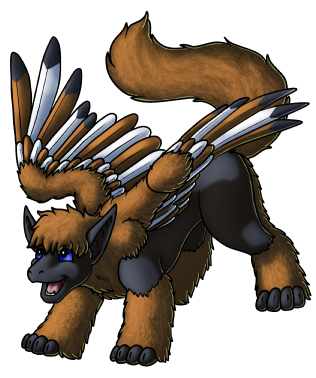 Derivative WorksHeight: 2'4" at the shoulder; Ss (average 2’) body size, E1E3 (long) ears, Ww (single-color) wingtips, Tt (long bushy) tail, Y1Y2 (blue) eyes, C4C7 (grey) body in ll (dark) value, X1X4 (brown) furnishings in Uu (medium) value, I1I4 (grey) wings in nn (light) value, P6P6 (wildcard, fur-color checker wings) in R1R4 (grey) color in Aa (medium) value