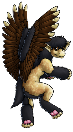 Derivative WorksHeight: 1'1" at the shoulder; SS (small 1’) body size, E1E2 (long) ears, Ww (single-color) wingtips, tt (short bushy) tail, Y4Y5 (dark brown) eyes, C3C8 (yellow) body in LL (light) value, X4X8 (grey) furnishings in uu (dark) value, I2I3 (brown) wings in NN (dark) value, P4P6 (mottled) in R2R2 (brown) color in Aa (medium) value