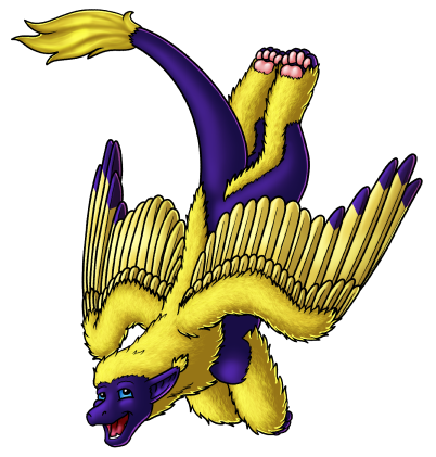 Derivative WorksHeight: 3'7" at the shoulder; ss (large 3') body size, E3E3 (long tufted) ears, Ww (single-color) wingtips, TT (tufted) tail, Y1Y2 (blue) eyes, C6C7 (purple) body in ll (dark) value, X3X7 (yellow) furnishings in Uu (medium) value, I4I5 (yellow) wings in Nn (medium) value, P3P6 (no visible pattern) in R2R8 (brown) color in aa (light) value