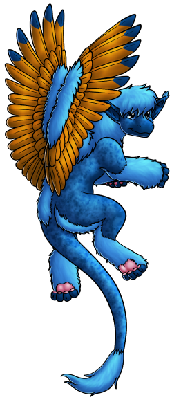 Derivative WorksHeight: 1'0" at the shoulder; SS (small 1’) body size, E3E3 (long tufted) ears, Ww (single-color) wingtips, TT (tufted) tail, Y1Y7 (blue) eyes, C7C8 (blue) body in ll (dark) value, X7X8 (blue) furnishings in Uu (medium) value, I3I8 (orange) wings in Nn (medium) value, P4P5 (mottled) in R7R8 (blue) color in Aa (medium) value