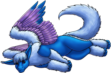 Derivative WorksHeight: 2'11" at the shoulder; Ss (average 2’) body size, E3E4 (long tufted) ears, ww (double-color) wingtips, Tt (long bushy) tail, Y2Y7 (dark blue) eyes, C7C7 (blue) body in Ll (medium) value, X7X7 (blue) furnishings in UU (light) value, I6I8 (purple) wings in nn (light) value, P2P5 (no visible pattern) in R6R7 (purple) color in aa (light) value
