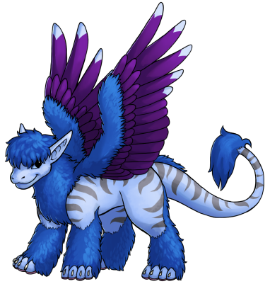 Derivative WorksHeight: 2'4" at the shoulder; Ss (average 2’) body size, E1E2 (long) ears, Ww (single-color) wingtips, TT (tufted) tail, Y1Y3 (blue) eyes, C7C8 (blue) body in LL (light) value, X7X7 (blue) furnishings in Uu (medium) value, I6I7 (purple) wings in NN (dark) value, P5P6 (striped) in R1R2 (grey) color in Aa (medium) value