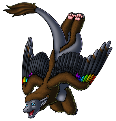 Derivative WorksHeight: 3'7" at the shoulder; ss (large 3’) body size; E3E4 (long tufted) ears; ww (double-color) wingtips; TT (tufted) tail; Y1Y3 (blue) eyes; C4C5 (grey) body in Ll (medium) value; X1X6 (brown) furnishings in uu (dark) value; I1I6 (grey) wings in NN (dark) value; P6P6 (wildcard, rainbow coverts) in R2R8 (brown) color in Aa (medium) value