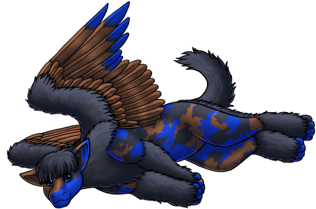 Derivative WorksHeight: 2'7" at the shoulder; Ss (average 2’) body size, E2E3 (short) ears, ww (double-color) wingtips, tt (short bushy) tail, Y2Y5 (dark blue) eyes, C7C8 (blue) body in Ll (medium) value, X4X6 (grey) furnishings in uu (dark) value, I2I7 (brown) wings in Nn (medium) value, P6P6 (wildcard, calico) in R2R7 (brown) color in Aa (medium) value