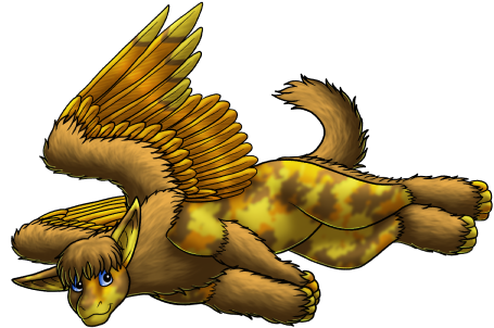 Derivative WorksHeight: 2'11" at the shoulder; Ss (average 2’) body size, E1E4 (long) ears, ww (double-color) wingtips, tt (short bushy) tail, Y1Y5 (blue) eyes, C3C3 (yellow) body in Ll (medium) value, X1X4 (brown) furnishings in Uu (medium) value, I3I3 (orange) wings in Nn (medium) value, P6P6 (wildcard, calico) in R2R3 (brown) color in Aa (medium) value