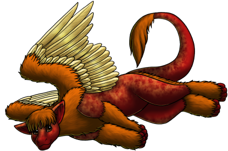 UnknownHeight: 2'1" at the shoulder; Ss (average 2’) body size, E2E4 (short) ears, WW (plain) wingtips, TT (tufted) tail, Y4Y6 (dark brown) eyes, C5C7 (red) body in ll (dark) value, X2X2 (orange) furnishings in uu (dark) value, I4I5 (yellow) wings in nn (light) value, P4P5 (mottled) in R3R7 (orange) color in Aa (medium) value